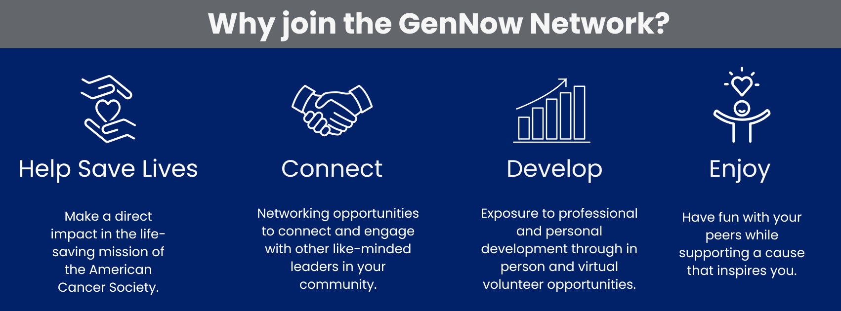 We are proud of the work we have made possible in the Austin community since initiating our efforts in 2021. Our GenNow Network Austin chapter is made up of members who are all support the American Cancer Society’s vision to end cancer as we know it, for everyone. With over $600,000 over the last 4 years we have been able to support the mission of the American Cancer Society and make a difference in the fight against cancer.